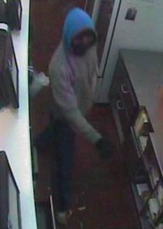 He was wearing a grey hooded jumper, black tracksuit pants and a green/blue balaclava.